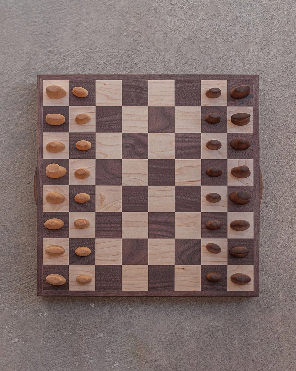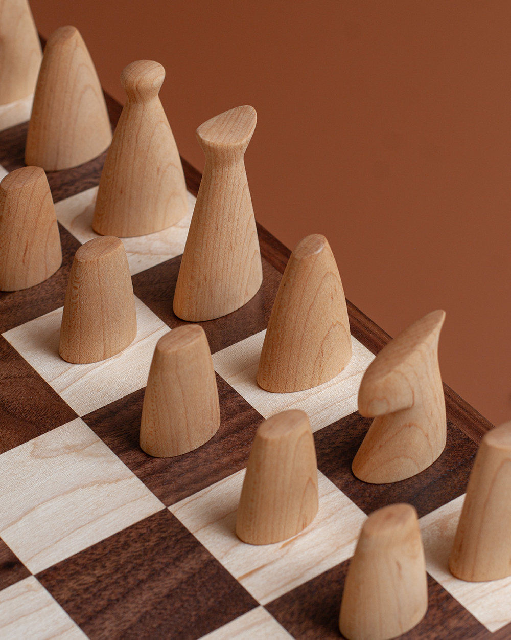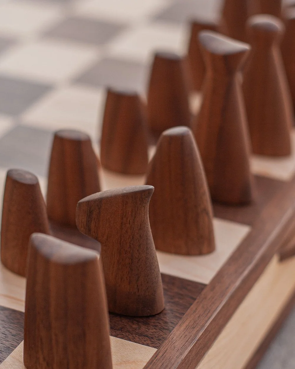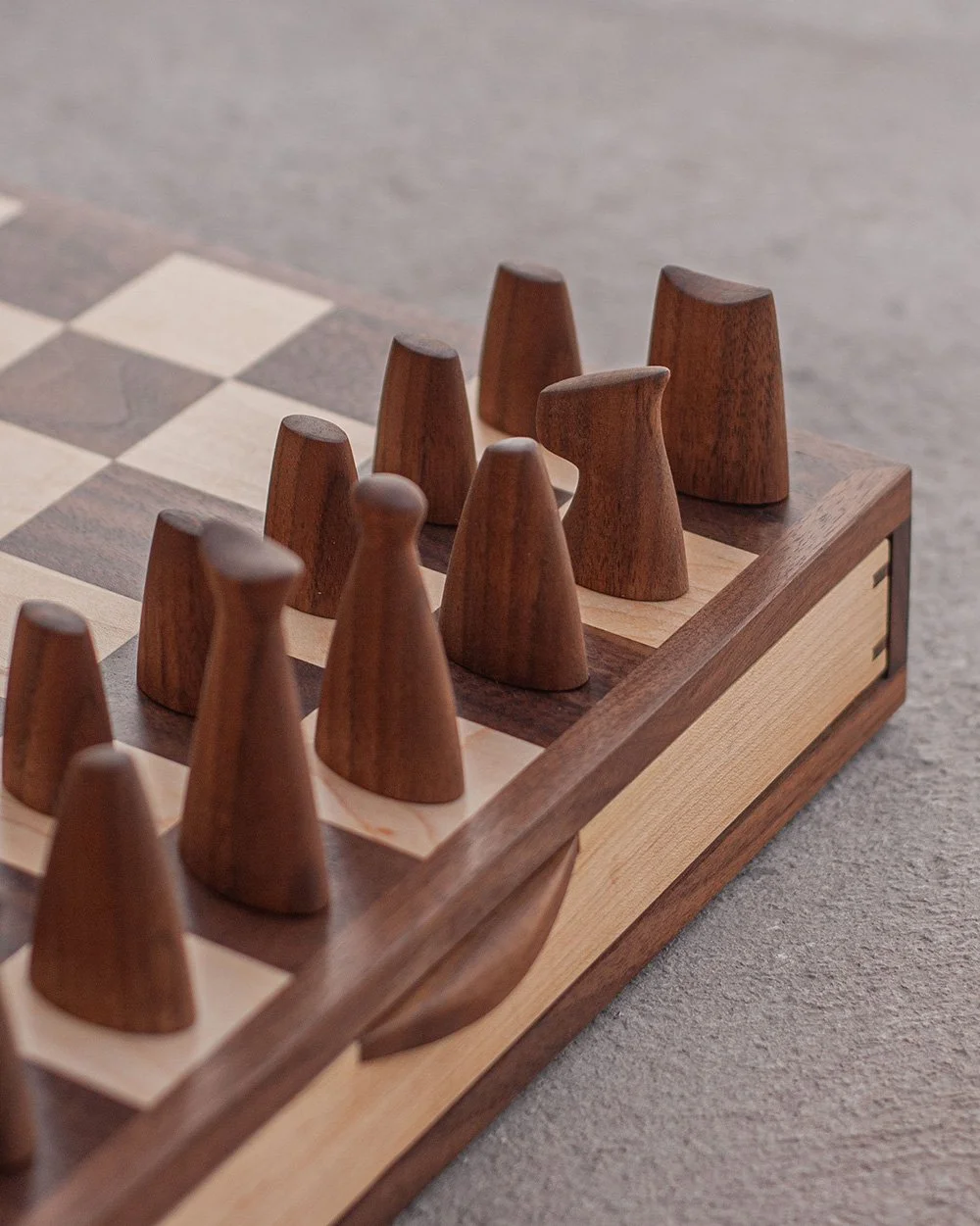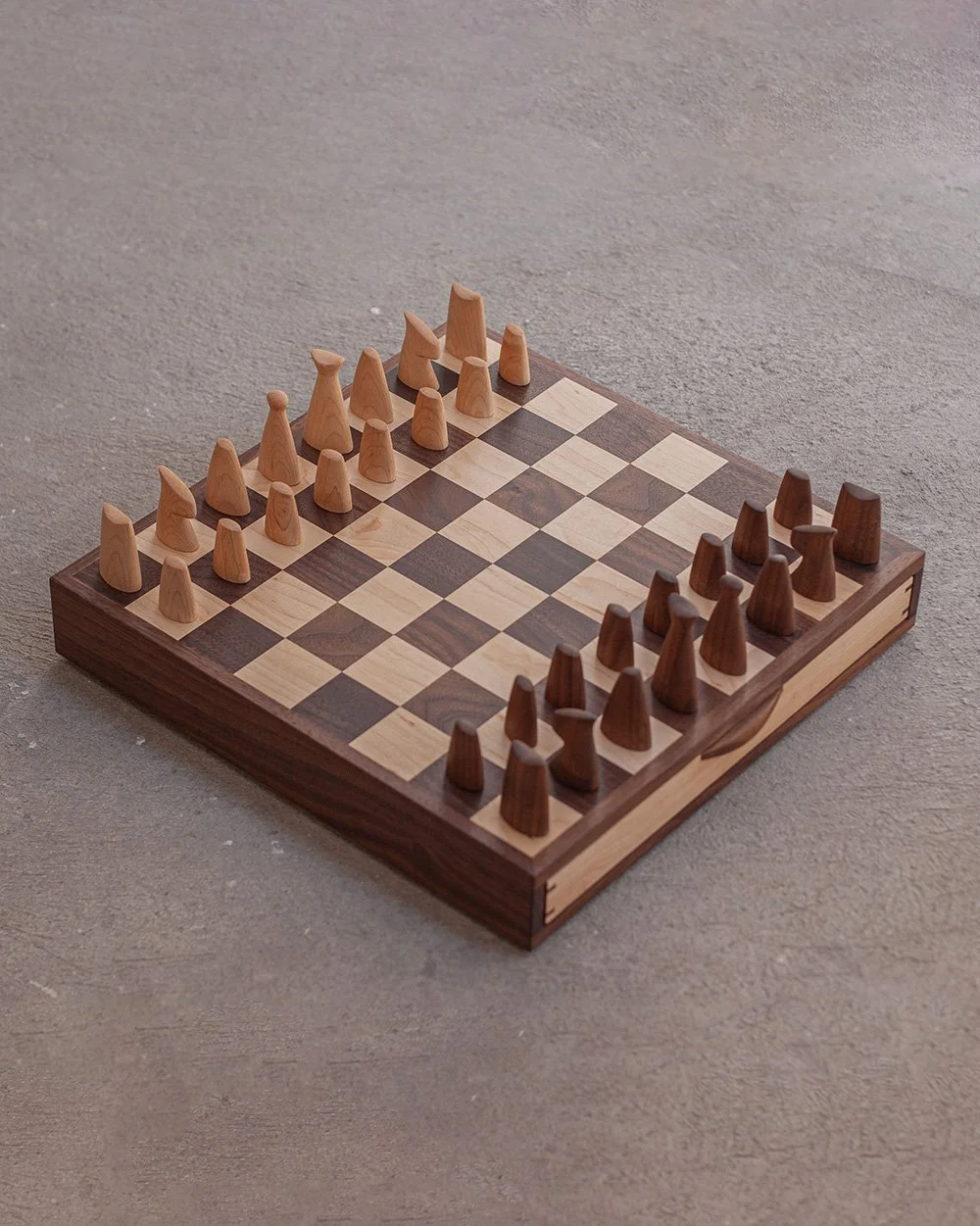 Caravanserai chess set in american maple and cherry (or walnut) wood, featuring pieces with smooth, streamlined, and slightly tapered shapes. Simple, minimalist, and modern design. Each piece has an inlaid metal rod for a satisfying weight. The board comes with built-in sliding drawers for convenient storage